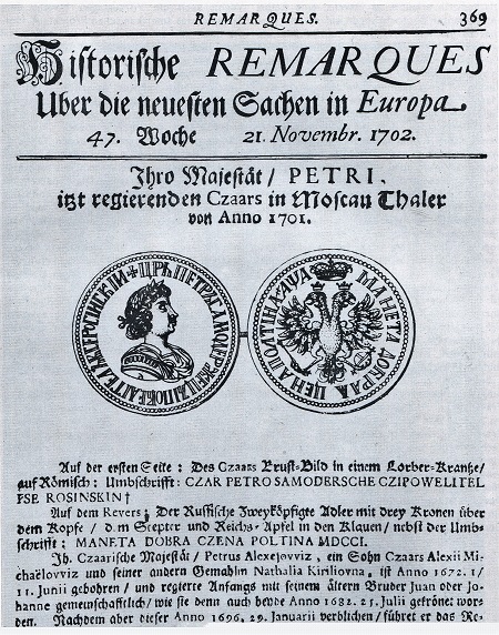 Peter I., der Große, wie die Mit- und Nachwelt den berühmtesten aller Zaren nennt, war ursprünglich zur Thronfolge nicht bestimmt. Mit zehn Jahren wurde er 1682 nach dem Tod seines älteren Bruders, des Zaren Fjodor III., unter Umgehung seines schwachsinnigen Stiefbruders Iwan V. zum Zaren ausgerufen. Da Peter noch zu jung war, übernahm seine Stiefschwester Sophie die Regentschaft. Um ihn von den Geschäften fernzuhalten, hat man ihn fern von Moskau aufwachsen lassen. Dort befasste sich der junge Mann mit Kriegs- und Flottenspielen und interessierte sich für technische Fragen. Er betätigte sich handwerklich und suchte Kontakt zu gebildeten Westeuropäern. 1689 entmachtete Peter seine Stiefschwester, schickte sie ins Kloster und übernahm die Allein- oder Selbstherrschaft, wie es auch auf russischen Münzen heißt. Sein Ziel war es, das Russische Reich dem Standard westeuropäischer Ländern anzugleichen und es zu einer allgemein geachteten, ja gefürchteten Großmacht zu entwickeln. Das gelang durch gesetzgeberische und organisatorische Maßnahmen, die der Zar mit aller Macht durchsetzte.