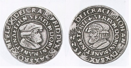 Ende des 15. Jahrhunderts kamen im silbereichen Sachsen neue, ungewöhnlich große und schwere Münzen auf. Man nannte sie anfangs Neue Münze, Uncialis nach dem Gewicht von etwa 31 Gramm oder Guldengroschen. Die sächsische Münzordnung von 1500 verkündete, dass es neben dem Gulden aus gutem Gold auch solche aus Silber geben soll. Kurfürst Friedrich III., genannt der Weise, griff mit dem Erlass eine Initiative des Tiroler Landesfürsten Erzherzog Sigismund des Münzreichen auf, der 1486 erstmals einen Guldengroschen als silbernes Äquivalent des Goldgulden schlagen ließ. Erst im frühen 16. Jahrhundert setzte sich für dieses Nominal der Name Thaler oder Taler durch, abgeleitet von schweren Silberstücken, die die Grafen Schlick im böhmischen Sankt Joachimsthal, heute Jáchymov, aus dem vor Ort gefundenen Edelmetall schlagen ließen. Versehen mit dem Porträt des Landesherrn mit Kurhut und Hermelinmantel, zeigen die rund 29 Gramm schweren Taler auf der Rückseite die mit einer "Klappmütze" bedeckten Porträts der beiden Herzöge Albrecht und Johann.