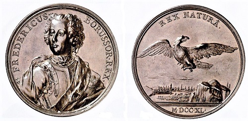 Als König Friedrich II. von Preußen am 31. Mai 1740 den Thron bestieg, blieb das Münzwesen seines Reiches zunächst von Veränderungen verschont. Bessere Sorten wie Dukaten und Taler wurden wie bisher vor allem zu Repräsentationszwecken geprägt, denn das Bildnis des jungen Königs sollte so schnell und so gut wie möglich verbreitet werden. Zu seiner Huldigung 1740 ließ der Monarch nach alter Tradition Medaillen und Münzen unters Volk werfen sowie an befreundete Höfe verteilen. Die Inschrift VERITATE ET IVSTITIAE (Für Wahrheit und Recht) auf den Huldigungsmedaillen war Programm. Denn gleich nach seiner Thronbesteigung schaffte der König die Folter ab und schränkte die Anwendung der Todesstrafe auf besonders schwere Verbrechen ein. Unter seiner Herrschaft kamen die unter seinem Vater, dem Soldatenkönig Friedrich Wilhelm I., verachteten Musen und Wissenschaften wieder zu ihrem Recht.