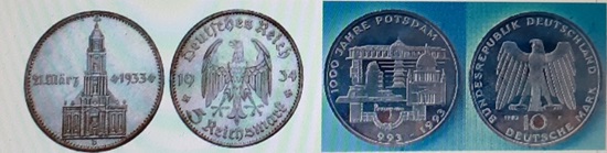 Die 1934 in hoher Auflage geprägten Gedenkmünzen aus Silber zum Tag von Potsdam am 21. März 1933 und das Zehn-Mark-Stück von 1995 zur Tausendjahrfeier von Potsdam liegen in vielen Sammlungen. Zu sehen sind auf ihm Schloss Sanssouci, der Einsteinturm, die Nikolaikirche und als Draufsicht das Neue Palais. Der Wiederaufbau der Garnisonkirche lag damals noch in weiter Ferne.