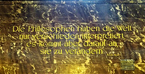 Das berühmte Zitat „Die Philosophen haben die Welt nur verschieden&xnbsp;interpretirt, es kömmt drauf an sie zu verändern“ schmückt das Vestibül des Hauptgebäudes Unter den Linden 6. Es stammt aus dem Buch „Marx über Feuerbach“ (originale Schreibweise), das 1888, fünf Jahre nach dm Tod von Karl Marx, von Friedrich Engels herausgegeben wurde.