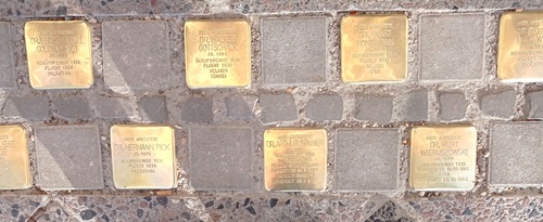 Im Straßenpflaster vor dem Hauptgebäude Unter den Linden 8 erinnern Stolpersteine an jüdische Professoren, Dozenten und Studenten, die von den Nationalsozialisten entlassen, verfolgt und ermordet wurden.