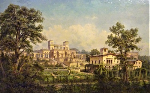 Das Orangerieschloss auf einem Gemälde aus dem 19. Jahrhundert im Besitz des Potsdam-Museums sowie auf einem aktuellen Foto mit der Terrassenanlage aus der Zeit Kaiser Wilhelms II. Das imposante Bauensemble mit Pflanzenhallen, Brunnen, Arkaden und Terrassen dokumentiert die Italiensehnsucht von König Friedrich Wilhelm IV.
