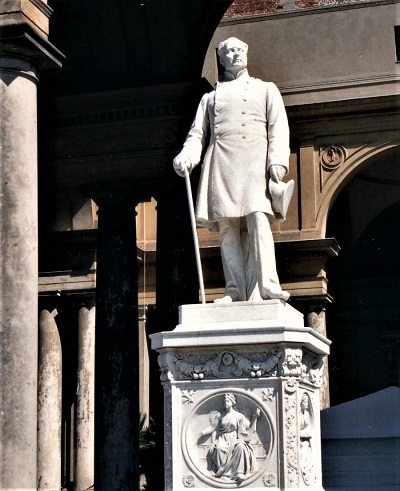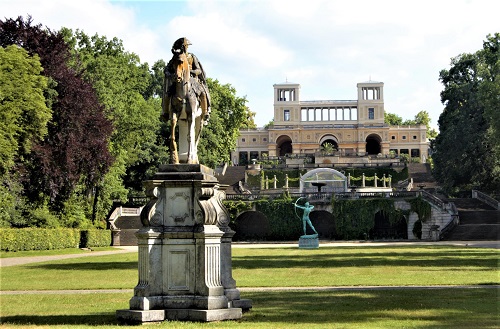 Vor dem Mittelbau des Orangerieschlosses mit den fürstlichen Wohnräumen und dem Raffaelsaal steht das Denkmal seines königlichen Erbauers Friedrich Wilhelm IV., der das Aussehen dieses Ensembles maßgeblich bestimmt hatte. Das Denkmal hatte den kommunistischen Bildersturm nach 1945 überstanden.