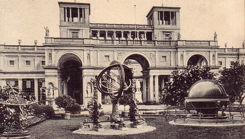 Auf der Postkarte sind astronomische Instrumente aufgestellt, die deutsche Truppen um 1900 während des Boxeraufstands von Peking nach Potsdam verschleppt hatten. Wilhelm II. empfing den so genannten Sühneprinzen Chun sitzend im Neuen Palais. Seinen Adlerhelm behielt der Kaiser während der Zeremonie demonstrativ auf dem Kopf. Der Prinz näherte sich unter mehrmaligen Verbeugungen dem Thron und verlas die offizielle Entschuldigung seines Landes vor und entfernte sich rückwärts gehend aus dem Saal.