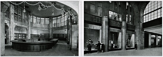 Das 1907 und 1908 nach Plänen von Franz Ahrens in nur 15 Monaten Bauzeit als Friedrichstraßen-Passage eröffnete Gebäude verbindet die Friedrichstraße mit der Oranienburger Straße und war nach den Kaiserpassagen die zweitgrößte Einkaufsmeile der Stadt. Die Baukosten betrugen sieben Millionen Mark. Der in Stahlbetonbauweise erbaute Komplex avancierte durch seine ungewöhnliche Konstruktion und sein reiches Warenangebot zu einem Highlight in der Spandauer Vorstadt. Die Fotos aus den 1920er Jahren zeigen den Eingang an der Oranienburger Straße mit dem Schriftzug AEG und einen Blick in die Ladenpassage.