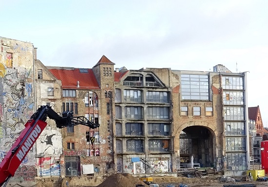 Wer dieser Tage an der Kreuzung Oranienburger Straße und Friedrichstraße im Berliner Bezirk Mitte entlang geht, wird den ehemalige Kunst- und Kulturstandort Tacheles nicht mehr erkennen. Fast alle Gerüste sind gefallen, die Fassaden haben Fenster bekommen, die Steinverkleidung wurde von Graffiti befreit und aufgehellt. Man kann durch den riesigen Komplex aus der Kaiserzeit von einer Straße zur anderen laufen und sieht, dass schon einige Läden geöffnet haben. Mieter und Bewohner ziehen nach und nach ein, und auch die Gastronomie ist da. Jahrzehntelang bot sich das Tacheles als ziemlich „verranzte“ Ruine dar, wie die Berliner sagen. In DDR-Zeiten waren bedeutende Bauteile auf dem Gelände zur Friedrichstraße hin abgerissen worden, doch der stattliche Rest an der Oranienburger Straße blieb stehen und wurde zum Teil auch von Künstlern genutzt.