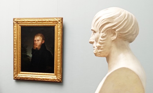 Am Beginn der Ausstellung blickt Caspar David Friedrich die Besucher an, die Gipsbüste im Vordergrund ist eine Arbeit von Gottlob Christian Kühn.