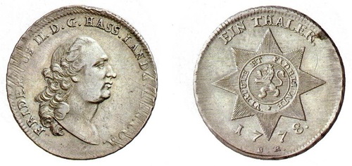 Mit so genannten Sterntalern von 1778 hat Landgraf Friedrich II. von Hessen Kassel im späten 18. Jahrhundert die Hinterbliebenen seiner in Amerika verbluteten „Landeskinder“ entschädigt.