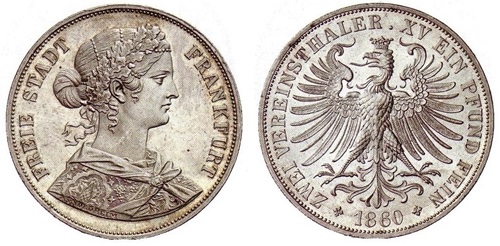 Stolz präsentiert sich Frankfurt am Main auf dem doppelten Vereinstaler von 1860 mit der Francofurtia, der Symbolfigur der Freien Stadt, da Fürstenbilder hier ausgeschlossen waren. Die Deklaration als Love Dollar verschaffte den Silberstücken in den USA guten Absatz.