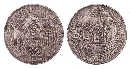 An die Verehrung, die die Heilige Ursula in Köln genießt, erinnern die elf schwarzen Flammen oder genauer gesagt die Hermelinschwänze im Stadtwappen. Die bretonische Prinzessin soll auf der Rückfahrt von einer Pilgerreise nach Rom mitsamt 11 000 Gefährtinnen von den Hunnen ermordet worden sein, die Köln belagerten. Die Ursula-Legende ist Gegenstand von Kölner Talern, die im frühen 16. Jahrhundert geschlagen und an Pilger verkauft wurden. Man schrieb ihnen Schutz vor Unglücksfällen, Krankheit und „bösem Blick“ zu. Auf der Vorderseite sind die auch Weisen aus dem Morgenland genannten Heiligen drei Könige Caspar, Melchior und Balthasar dargestellt, wie sie gleichsam das Kölner Wappen bewachen und segnen. Auf der Rückseite steht die Heilige Ursula in Begleitung der Jungfrauen an Bord eines Segelschiffs. Dass auf ihnen ein Papst mit seiner dreifachen Krone dargestellt ist, geht auf die Legende zurück, dass dieser mit weiteren Kirchenfürsten an der Rückfahrt nach Rom teilgenommen hat. Die Heiligsprechung der frommen Prinzessin und Märtyrerin brachte ihr ehrendes Gedenken, den Bau einer Kirche und Verehrung durch Gemälde und Skulpturen. Die Ursulataler von 1512 und 1516 wurden an Pilger verkauft. Von ihnen kommen Doppelstücke sowie halbe Taler, Zweidrittelstücke und weitere Werte vor, und es gibt auch besonders kostbare Abschläge aus Gold. Ausgaben ohne Jahreszahl sind späteren Datums. Die Vielzahl der Varianten unterstreicht, welch hohen Rang man den Ursulatalern als Amulette und Belege für eine Pilgerfahrt zuschrieb.