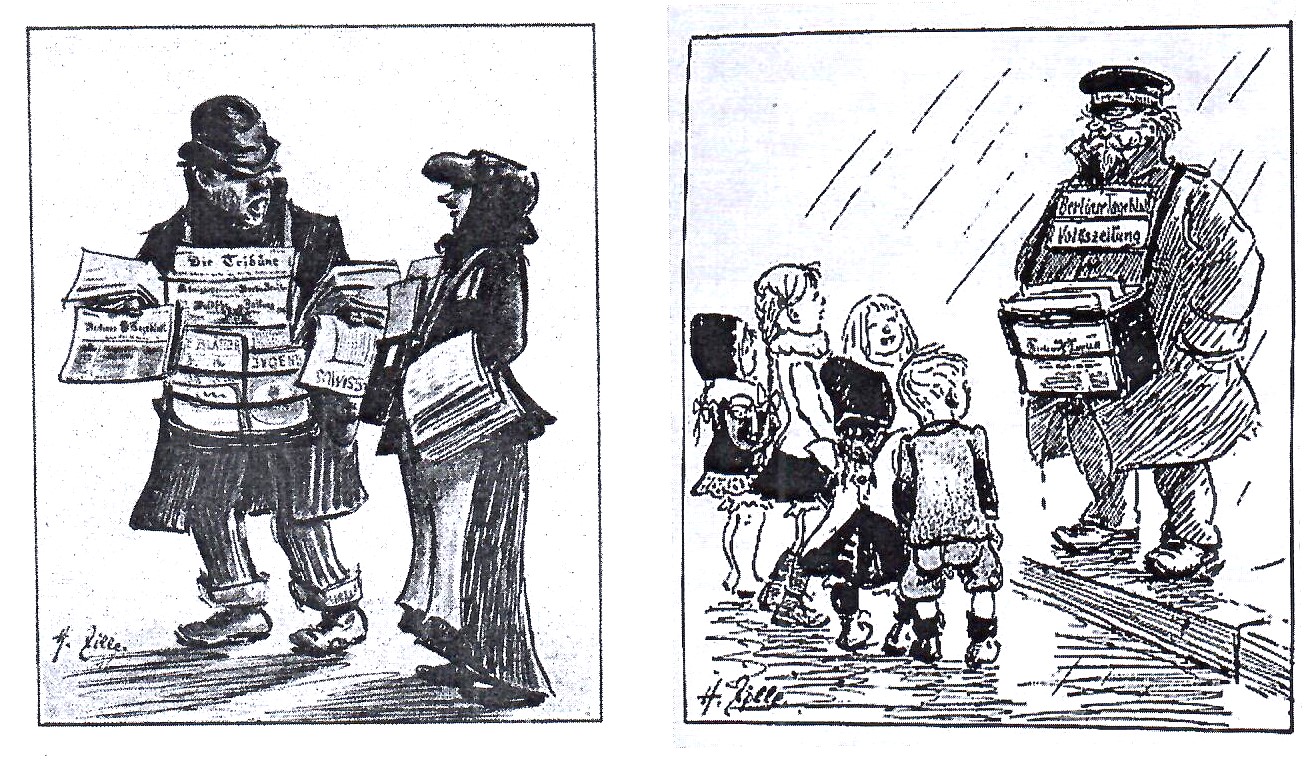 Heinrich Zille hat Zeitungsverkäufer auf Berliner Straßen genau beobachtet. Hier sagt der auf der Friedrichstraße auf Kundschaft wartende Mann zu seiner Kollegin: „Müller'n, heite wird’s en Jeschäft!Acht Prozesse, drei Morde, zwee Bankjehs, zwee Sitte, Spione und Attentate, zwee Flieger gestürzt, een Luftschiff verloofen.“ Die Kinder erfahren von dem anderen Zeitungsmann, was „Sache“ ist.