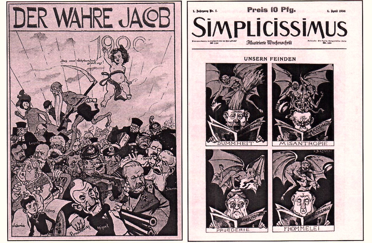 Regimekritische Zeitungen und satirische Zeitschriften wurde offiziell verdammt, konnten sich aber gegen vielfältige Hindernisse behaupten. Unter den Lesern waren auch solche, die niemals zugegeben hätten, dass sie solche „Schund- und Schmutzliteratur“ anfassen, wie politische Gegner sagten. Den Kaiser direkt anzugehen, traute man sich nicht. Ein Verfahren wegen Majestätsbeleidigung wäre die Folge gewesen. Statt seiner nahmen sich Witz- und andere Blätter seine aufgeblasenen Helfer zur Brust. Die Karikatur im Simplicissimus schildert, wie der Teufel der Satire Gehirnwäsche betreibt.