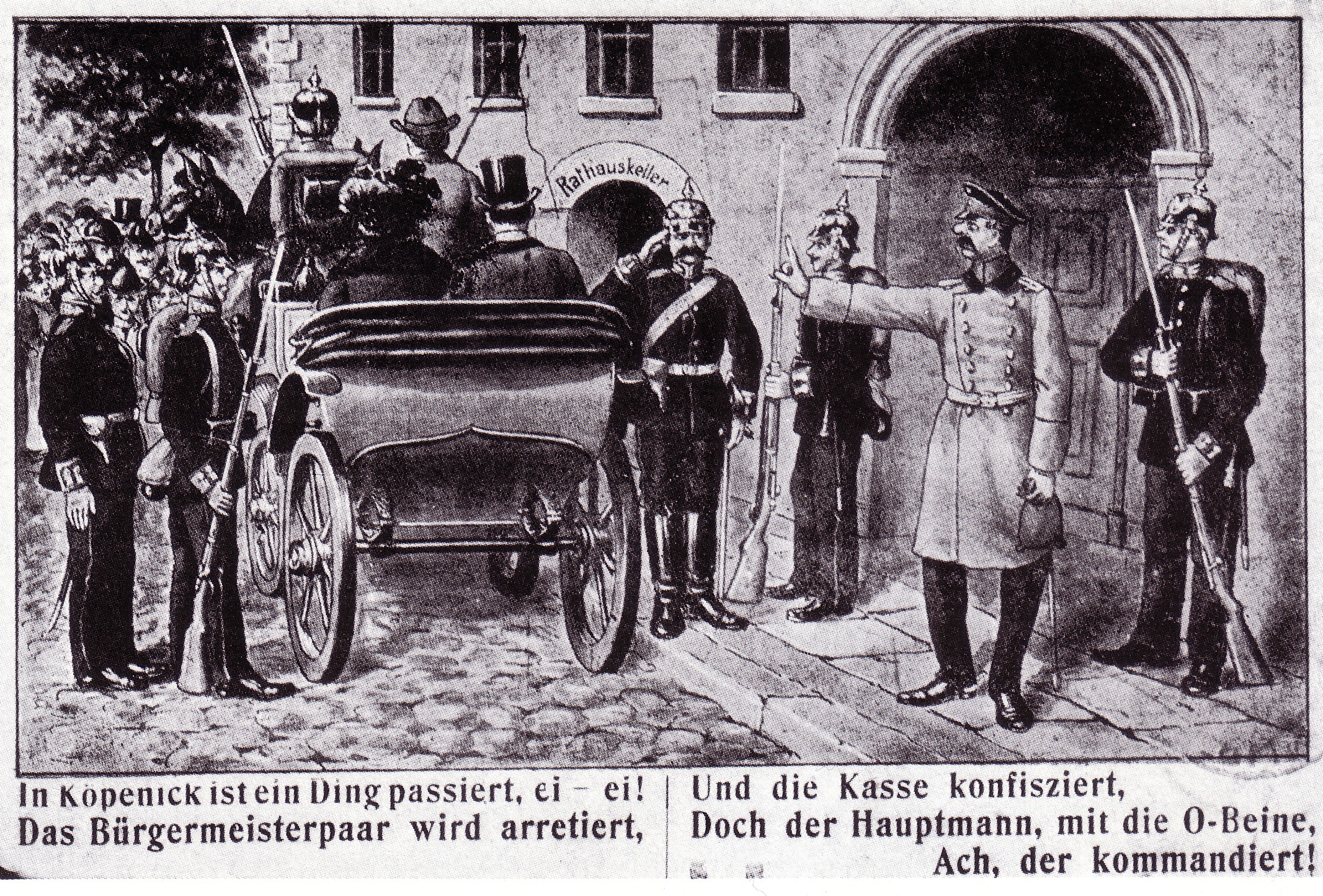 Dem in eine schlottrige Hauptmannsuniform gehüllten Schuster Wilhelm Voigt blieb es am 16. Oktober 1906 vorbehalten, der Welt vorzuführen, wie weit preußisch-deutscher Kadavergehorsam gehen kann. Das Satireblatt „Simplicissimus“ schlug vor, ihn mit dem Friedensnobelpreis auszuzeichnen, „weil es ihm auf so unnachahmliche Weise gelungen ist, den Militarismus lächerlich zu machen“. Sogar Kaiser Wilhelm II. soll sich auf die Schenkel geschlagen haben, als er von dem frechen Überfall auf den Bürgermeister von Köpenick bei Berlin und die Stadtkasse hörte. Dem kurzzeitig festgesetzten Beamten und seinen Untergebenen indes blieb das Lachen im Halse stecken, denn sie waren auf einen Hochstapler reingefallen und wurden nun der Presse zum Fraß vorgeworfen.