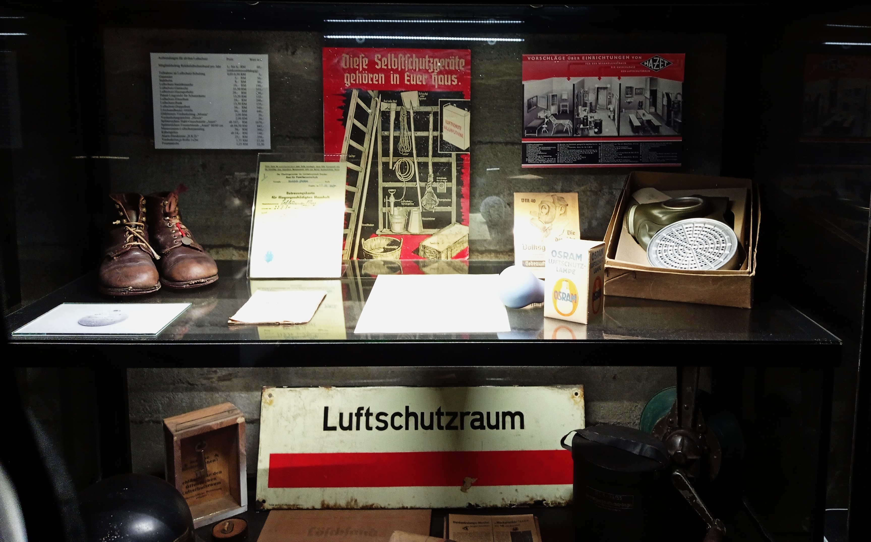 An anderer Stelle sind Reste von Silberbestecks aus der Reichskanzlei und dem zerbombten Restaurant Lutter & Wegner am Gendarmenmarkt sowie geschmolzenes Glas, zerbrochene Keramik und Haushaltsgegenstände ausgelegt. An den Wänden sieht man Farbfotos von Malereien aus dem so genannten Fahrerbunker neben Hitlers Reichskanzlei, in dem SS-Leute ihre Visionen von einem „germanischen“ Leben nach dem Krieg an die Wand malten. Zu sehen sind überdies Reste einer großen Stierfigur aus Marmor am Bunker im Humboldthain sowie verrostete Pistolen, Gewehre, Granaten, Brandbomben, zerschossene Helme und Reste der berühmten Verschlüsselungsmaschine Enigma. Der Rundgang führt in eine Krankenstation mit Betten, einem Waschbecken sowie Spritzen, Operationsbesteck und eine Hausapotheke. An der Wand appelliert ein Aushang unter dem Motto „Die Heimatfront steht“ an den Durchhaltewillen der Zivilbevölkerung.