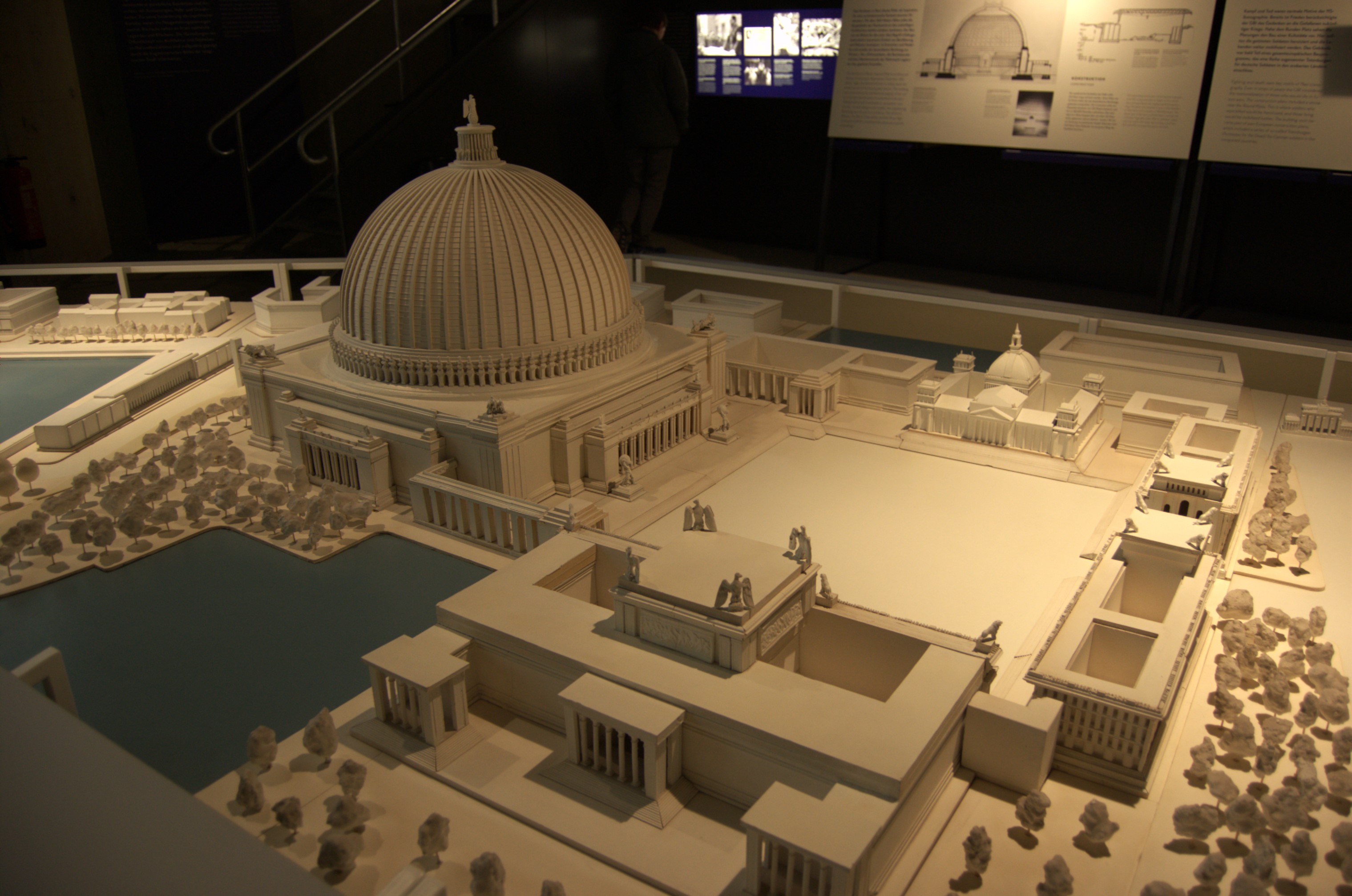 In einem zweiten Bunker nördlich des Bahnhofs Gesundbrunnen zeigt der Verein Berliner Unterwelten mit einem Modell sowie Fotos und Dokumenten, wie sich Hitler und sein Stararchitekt Albert Speer die „Welthauptstadt Germania“ vorstellten und was der Bombenkrieg von Berlin übrig ließ, hier das Haus Vaterland am Potsdamer Platz.