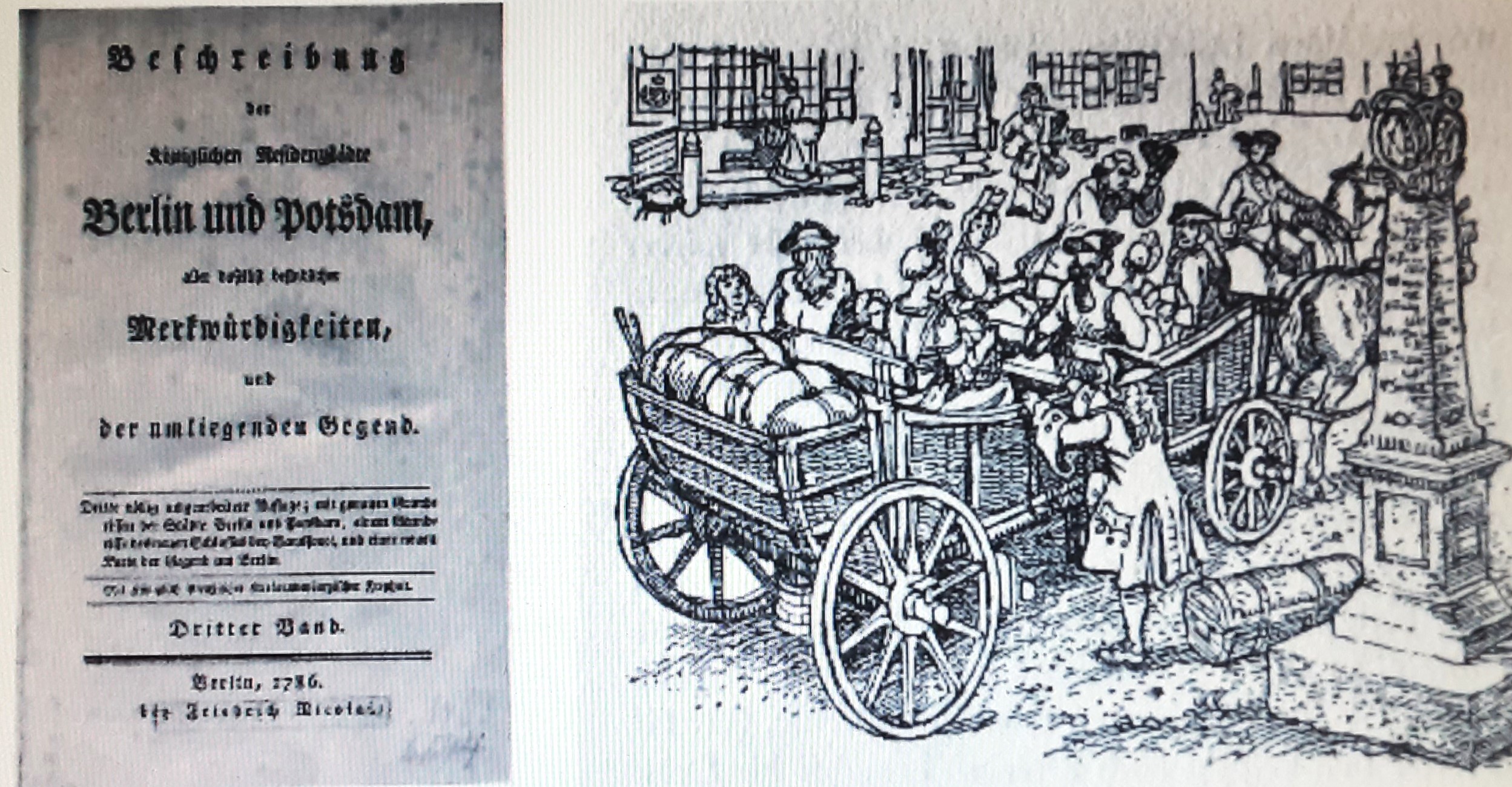 Wer sich auf den Weg nach Berlin und Potsdam machte, fand in Friedrich Nicolais von Zeit zu Zeit aktualisierte Reisebeschreibung über Sehenswürdigkeiten und Bauwerke hinaus gehende Informationen. Wer Glück und eine verlässliche Kutsche samt Begleitung, kam gut ans Ziel. Die Grafik zeigt eine Reisegesellschaft in Sachsen, kenntlich an den kurfürstlich sächsischen königlich-polnischen Post- oder Distanzsäulen.