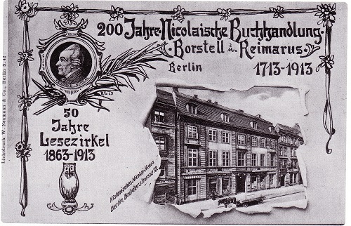 Nicht weit vom Königlichen Schloss hatte Friedrich Nicolai in der Brüderstraße 13 sein Wohn- und Verlagshaus. Der von ihm ausführlich beschriebene Bau erlebte vor einigen Jahren als Humboldt Forum seine Wiedergeburt. Das Nicolaihaus - hier auf einer Postkarte von 1913 - hat sich zu einem bedeutsamen Kultur- und Wissenschaftsstandort entwickelt. Zurückgekehrt ist auch der Nicolai Verlag.