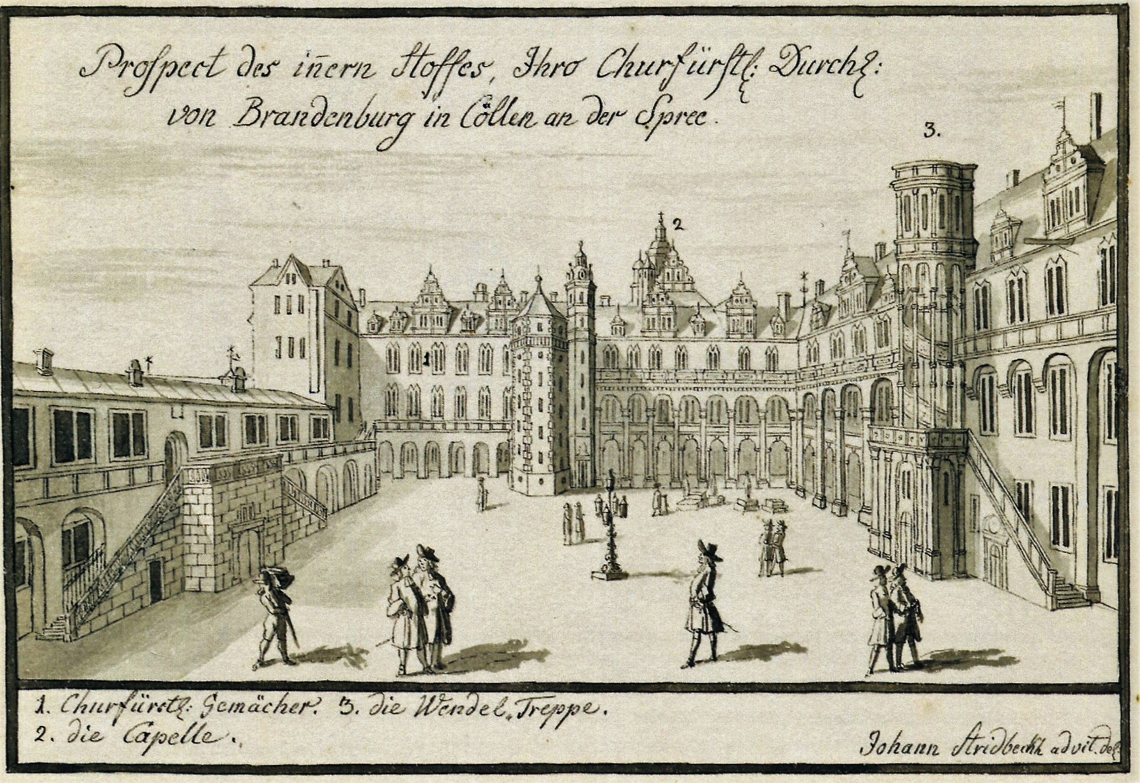 Der Augsburger Zeichner, Kupferstecher und Verleger Johann Stridbeck der Jüngere besuchte 1690/1691 die Haupt- und Residenzstadt an der Spree und fertigte 20 Zeichnungen an, die in der Berliner Staatsbibliothek verwahrt werden. Hier ist kurfürstliche Schloss vor seinem Umbau durch Andreas Schlüter in einen königlichen Palast zu sehen.