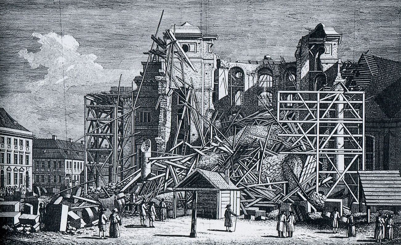Der Zusammenbruch der halbfertig erbauten Deutschen Kirche, auch Dom genannt, im Jahr 1781 war ein großes Unglück, auf das Nicolais Berlin-Buch näher eingeht.