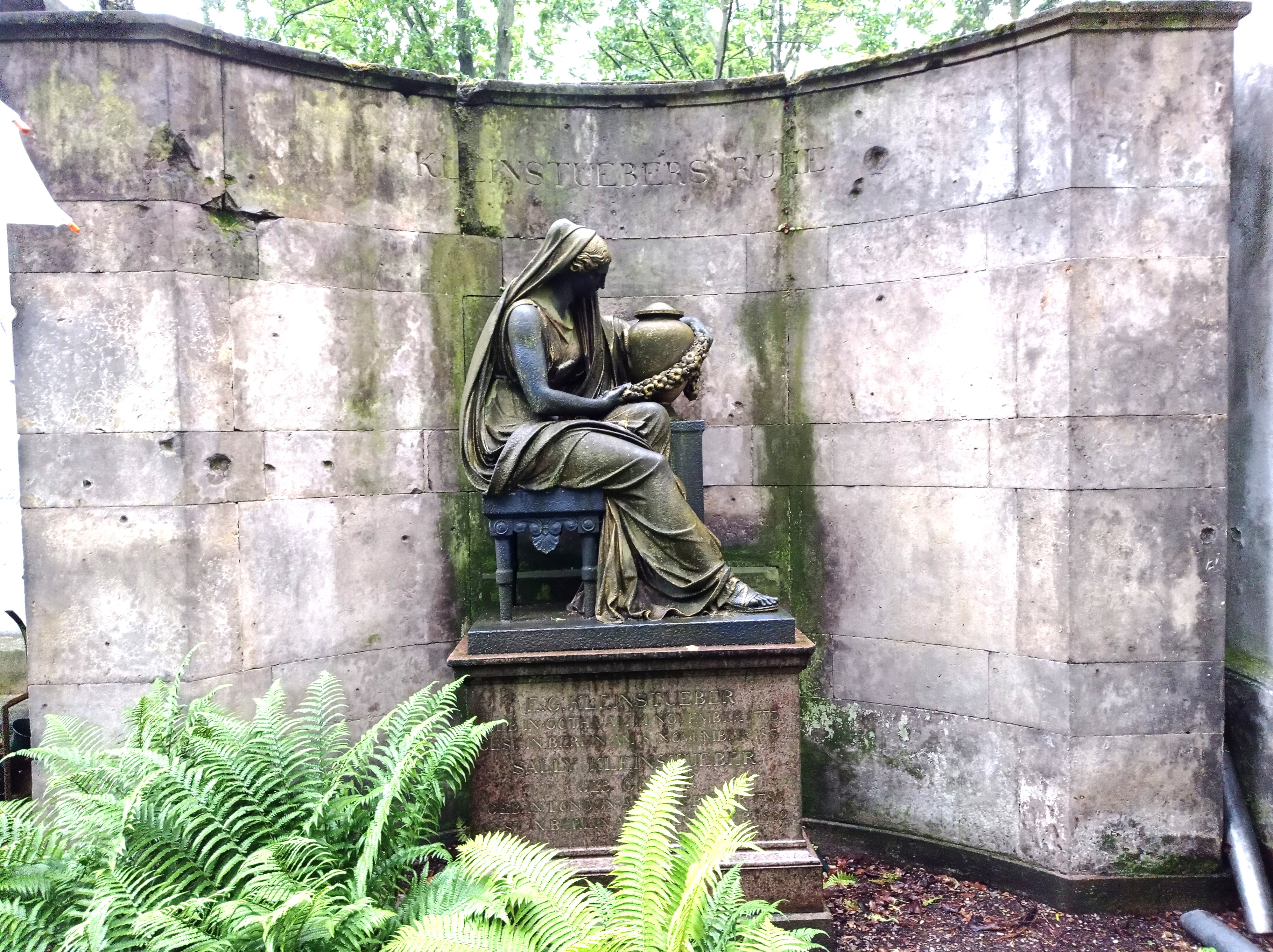 Die ältesten Grabmäler auf dem im 19. Jahrhundert vor den Toren der Stadt angelegten Sankt-Georgen-Friedhof an der Greifswalder Allee besitzt ein Grabmal, wie man es nicht noch einmal in Berlin findet. Dass das Grabmal auf einer ...geprägten Medaille abgebildet ist, stellt eine Ausnahme dar. Es erinnert n den königlich-preußischen Münzmechaniker Johann Gottlieb Ernst Kleinstüber (1773-1834). Ganz dem Klassizismus der Schinkelzeit verpflichtet, zeigt es eine sitzende Frau in antikisierender Gewandung, die um eine Urne einen Lorbeerkranz legt. Die teilweise Vergoldung verleiht der Darstellung zusätzliche Strahlkraft. Die halbovale Wand hinter der Trauernden besagt, dass sich hier KLEINSTÜBERS RUHE befindet.