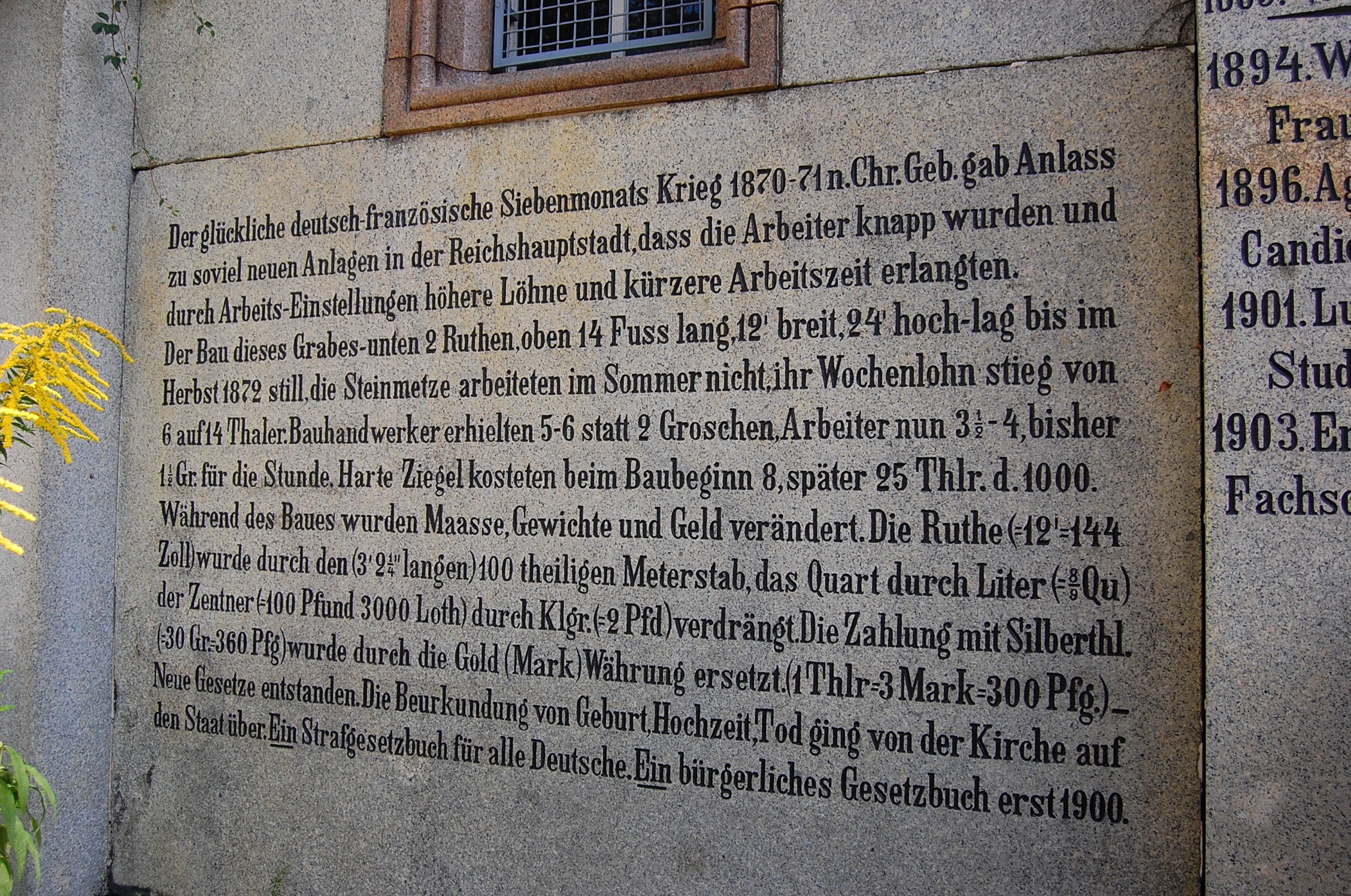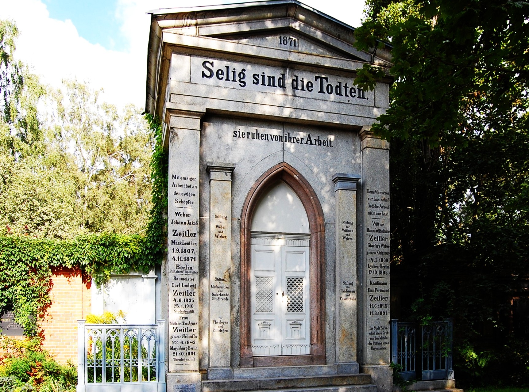 Nur wenige Schritte vom Kleinstüberschen Grabmal gibt es ein anderes, ebenfalls numismatisch interessantes Grabmal aus der Zeit der Reichseinigung (1871) zu bestaunen. Hier wurden Angehörige der Berliner Baumeisterfamilie Zeitler bestattet. „Die Stadt Berlin erhält diese Gruft aus den Mitteln der Stiftung eines Ungenannten“ ist zu lesen. „Selig sind die Todten, sie ruhen von ihrer Arbeit“ verkündet die Inschrift unter dem Giebel. Auf allen Seiten des Mausoleums sind Inschriften angebracht. An einer Seitenwand liest man Informationen über Löhne und Preise nach dem „glücklichen deutsch französischen Siebenmonats Krieg 1871 71 n. Chr.“ In Berlin habe es so viel Arbeit gegeben, dass die Arbeiter „knapp“ waren. Man löste das Problem durch „höhere Löhne und kürzere Arbeitszeit“, ist auf der noch gut erhaltenen Granittafel zu lesen. Die Inschrift erwähnt, dass während der Bauzeit auch die bisher üblichen Maße und Gewichte sowie das Geld verändert wurden. Die Umstellung erfolgte von Rute und Zoll auf den „100 theiligen Meterstab“, und man gab auch die Zahlung in Talern ab und ging zur Mark über. Neue Gesetze seien entstanden, heißt es ganz zum Schluss. Hier erwähnt die Inschrift speziell die, wie wir heute sagen würden, Einführung der Zivilehe und das neu geschaffene „Strafgesetzbuch für alle Deutschen“.