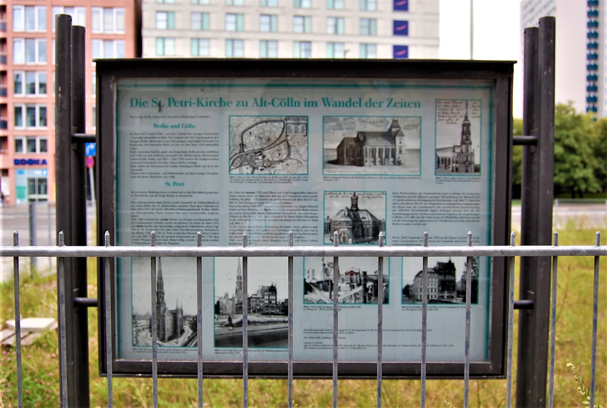 Die Schautafel zeigt die historische Bebauung des Petriplatzes, den man auch „Wiege Berlins“ nennt. Neben dem Ausstellungshaus zeigt ein Mosaik im Boden, was Archäologen finden und welche Arbeitsgeräte sie benutzen.