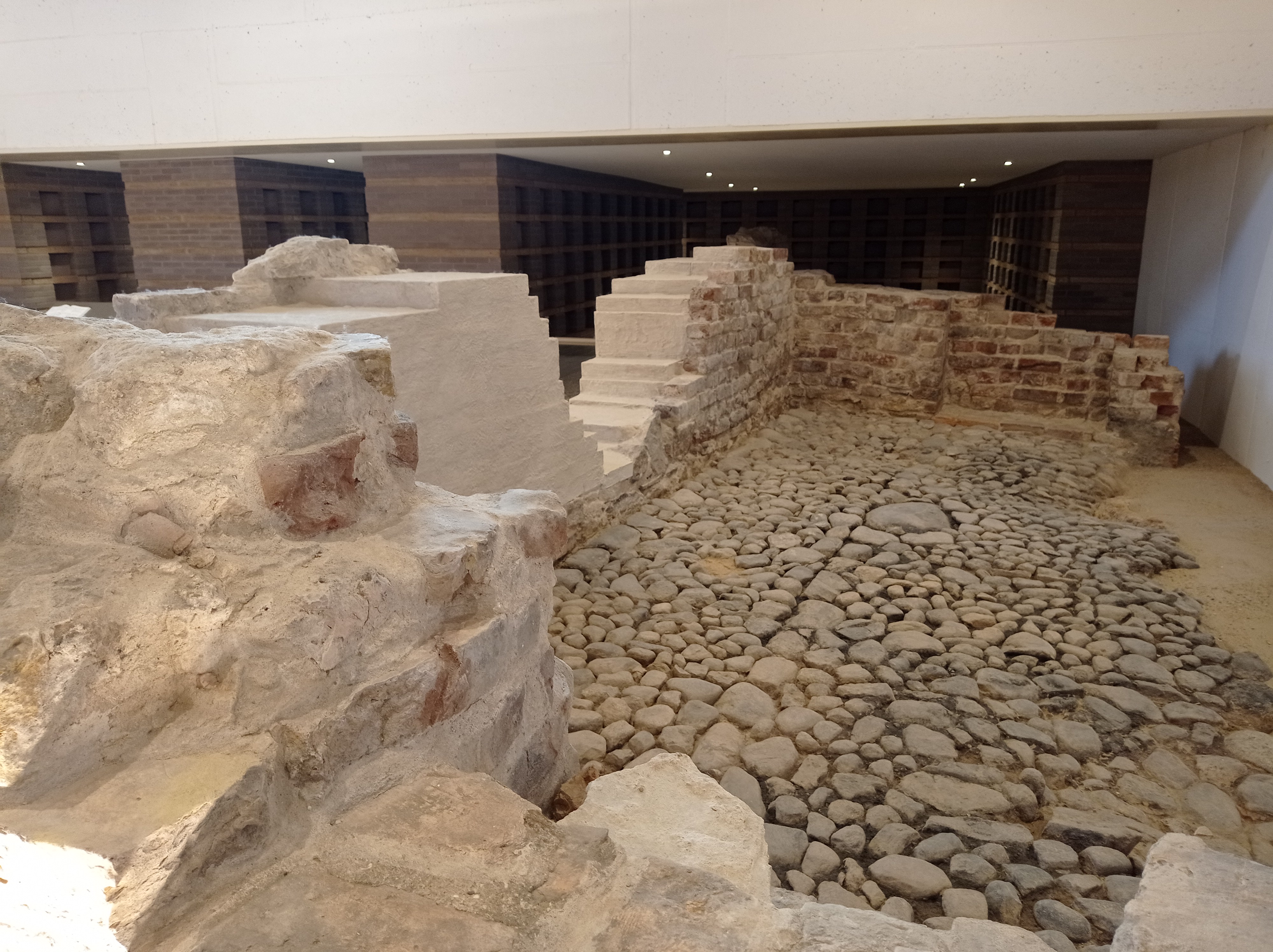 Hinter den Fundamenten der Lateinschule und Resten eines Straßenpflasters befindet sich leicht abgedunkelt das Ossarium mit den Gebeinen der Ur-Berliner.