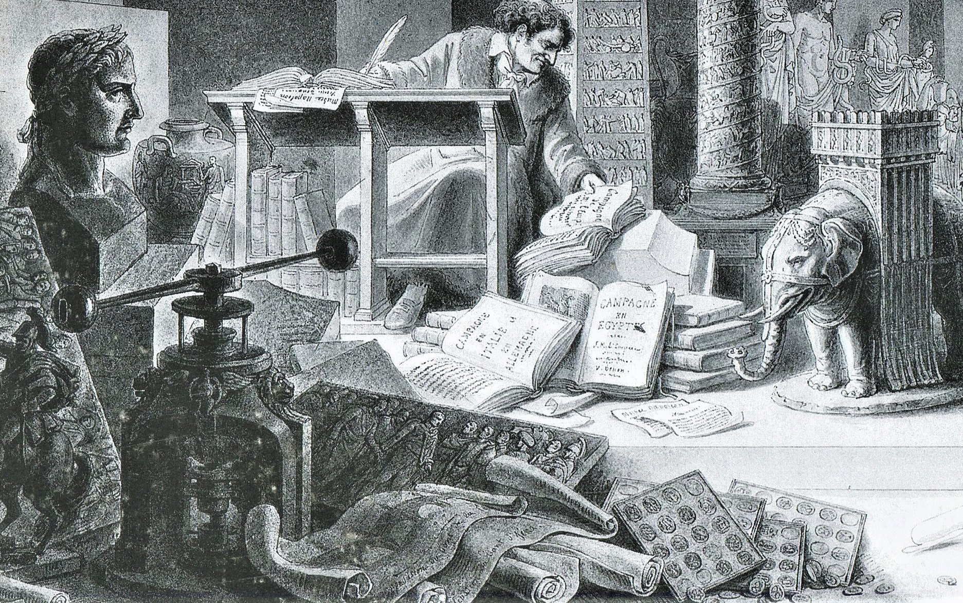 Ausgestattet mit dem angemaßten „Recht des Siegers“, fand Napoleons Kunstexperte Dominique Vivant Denon in den besetzten Staaten, was dem Louvre noch fehlte. Die Grafik zeigt, wie Denon die Ergebnisse der napoleonischen Raubzüge in Büchern notiert. Die Spindelpresse im Vordergrund deutet an, dass Napoleons Kunstexperte auch Direktor der Monnaie de la Médaille in Paris ist.