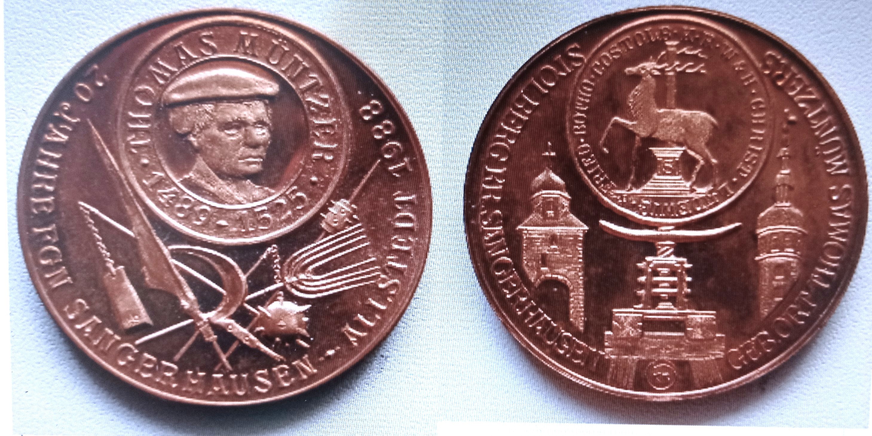 Im Unterschied zu Gedenkmünzen der DDR waren die in großer Zahl geprägten Kulturbund-Medaillen leichter zu bekommen. Hier eine Ausgabe von 1988 zu Ehren des Bauernführers von 1525, Thomas Müntzer.