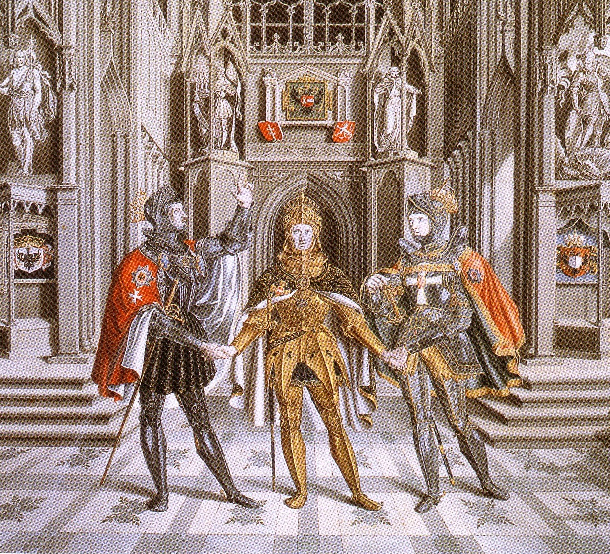 Drei Monarchen beschwören in mittelalterlicher Kulisse die 1815 beschlossene Heilige Allianz.