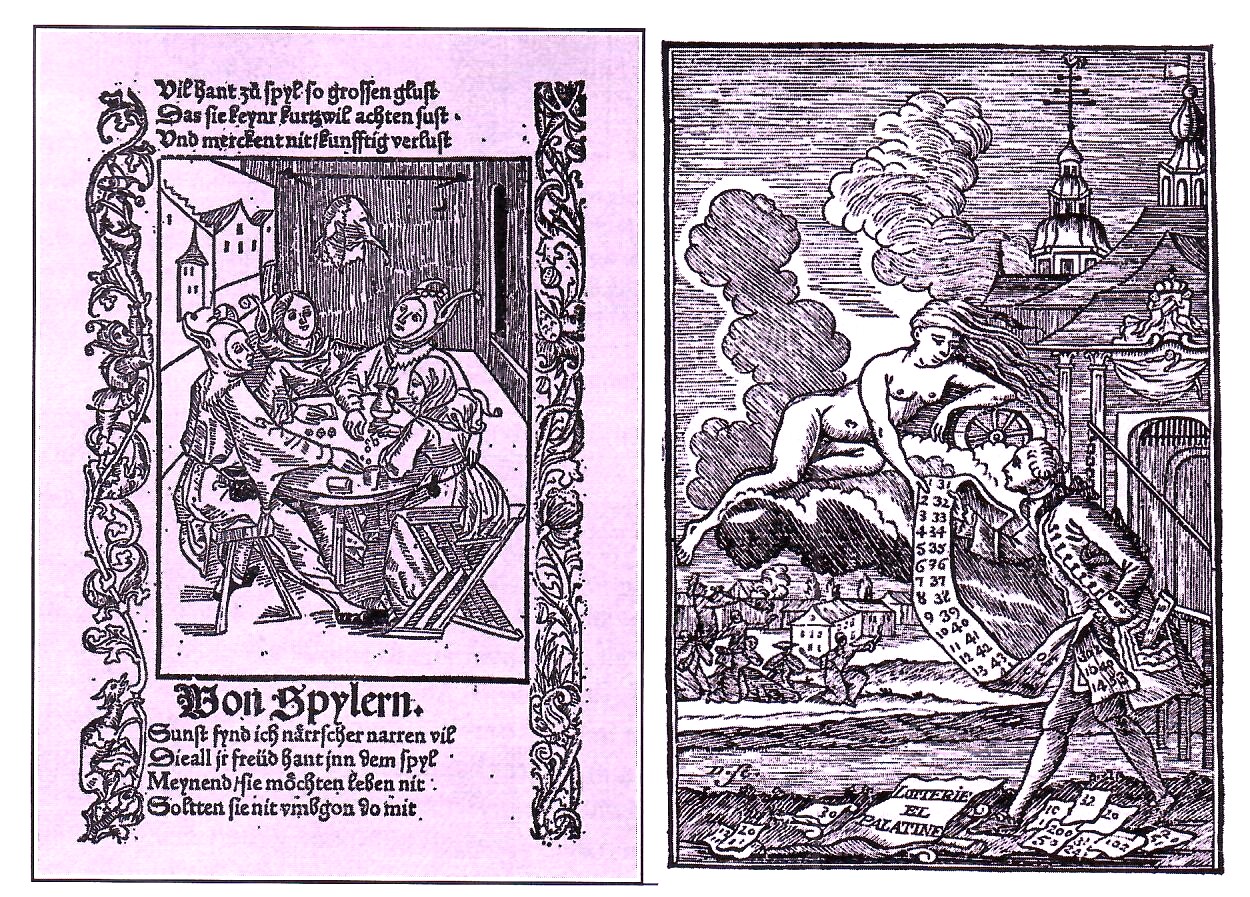 Viele Leute haben Freude am Karten- und Würfelspiel und denken nicht an Verluste, die sie dabei erleiden können. Deshalb rät Sebastian Brant in seinem Buch „Narrenspiegel“ von 1494 davon ab, sich auf diese „Kurzweil“einzulassen, an der auch Frauen und sogar Geistliche teilnehmen. Die Grafik aus der Pfalz wirbt für sagenhafte Gewinne beim Lotto.