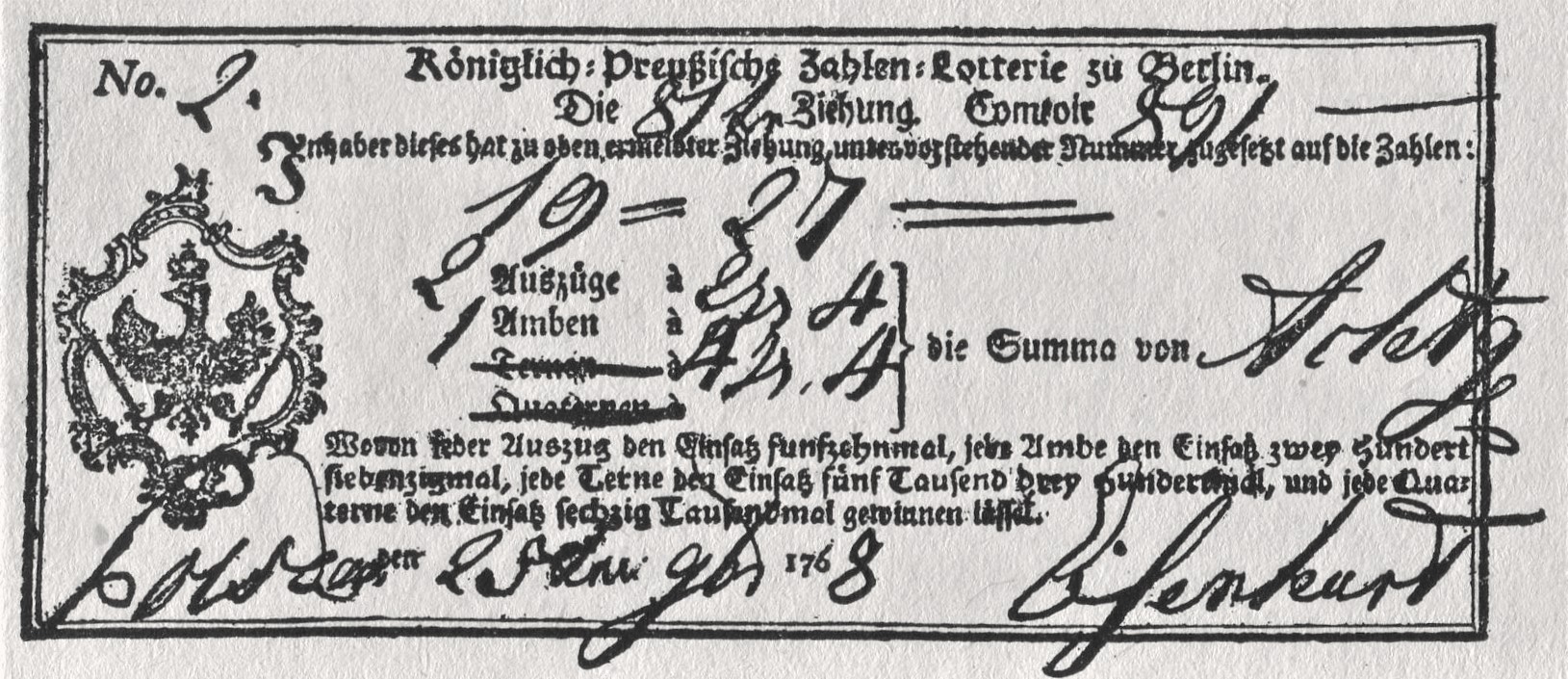 Lottozettel wie dieser Berliner Schein aus dem Jahr 1768 waren wie die damaligen Banknoten leicht zu fälschen, weshalb man bald dazu überging, bessere Vorlagen auszugeben und Kontrollen zu verstärken.