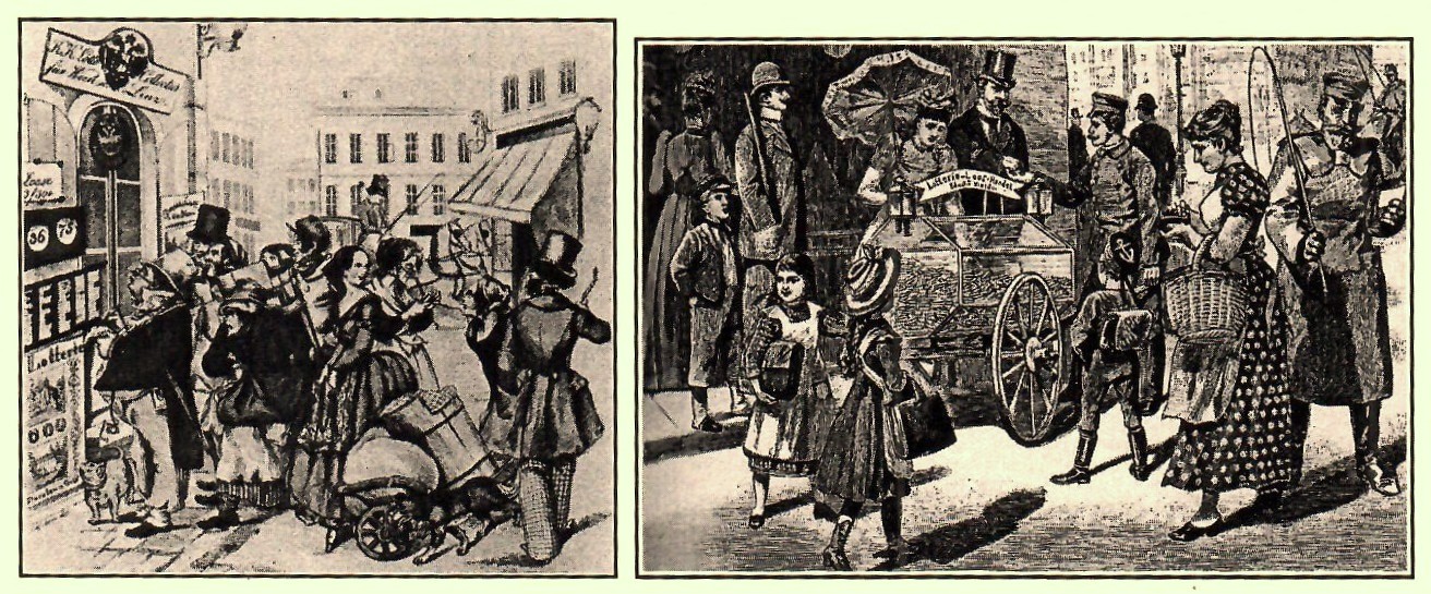 Die Grafiken zeigen, wie so genannte kleine Leute ein Lottobüro stürmen und dort in der Hoffnung auf viele Taler ihre letzten Groschen zu lassen. Der Straßenverkauf von Losen war schon im 19. Jahrhundert üblich.