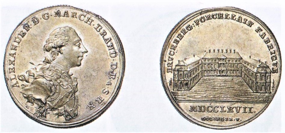 Die Medaille von 1767 aus Brandenburg-Ansbach mit Ansicht der Bruckberger Porzellanfabrik ist ein Beleg dafür, dass deutsche Landesfürsten für das Glücksspiel geworben haben.