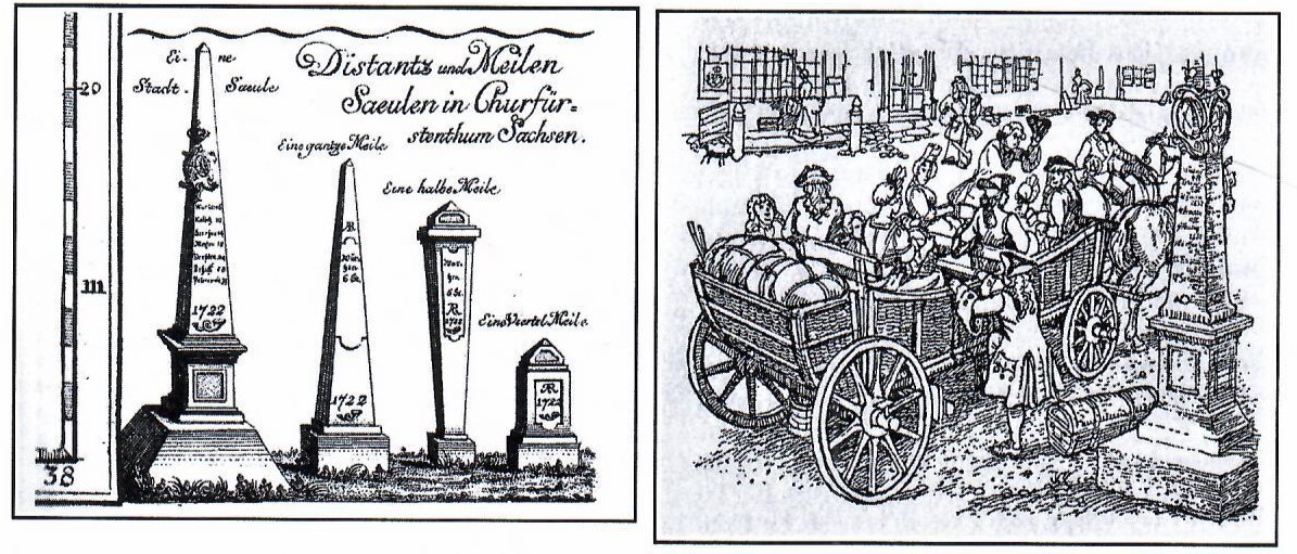 Kursachsen wurde schon im ausgehenden 16. Jahrhundert vermessen. Um 1700 gab es auch in anderen Territorien, etwa Pommern und Mecklenburg, solche Erhebungen. Der Pfarrer und Kartograph Adam Friedrich Zürner legte im Auftrag Augusts des Starken mit seinem „geometrischen Wagen“ in Kursachsen sowie weiteren sächsisch-ernestinischen Fürstentümern über 18 000 sächsische Meilen zurück. Das waren umgerechnet rund 163 116 Kilometer. Schon 1717 erschien Zürners erste „Chur-Sächsische Post-Charte“. Vier Jahre später befahl der Kurfürst und polnische König die Errichtung der steinernen Postsäulen.