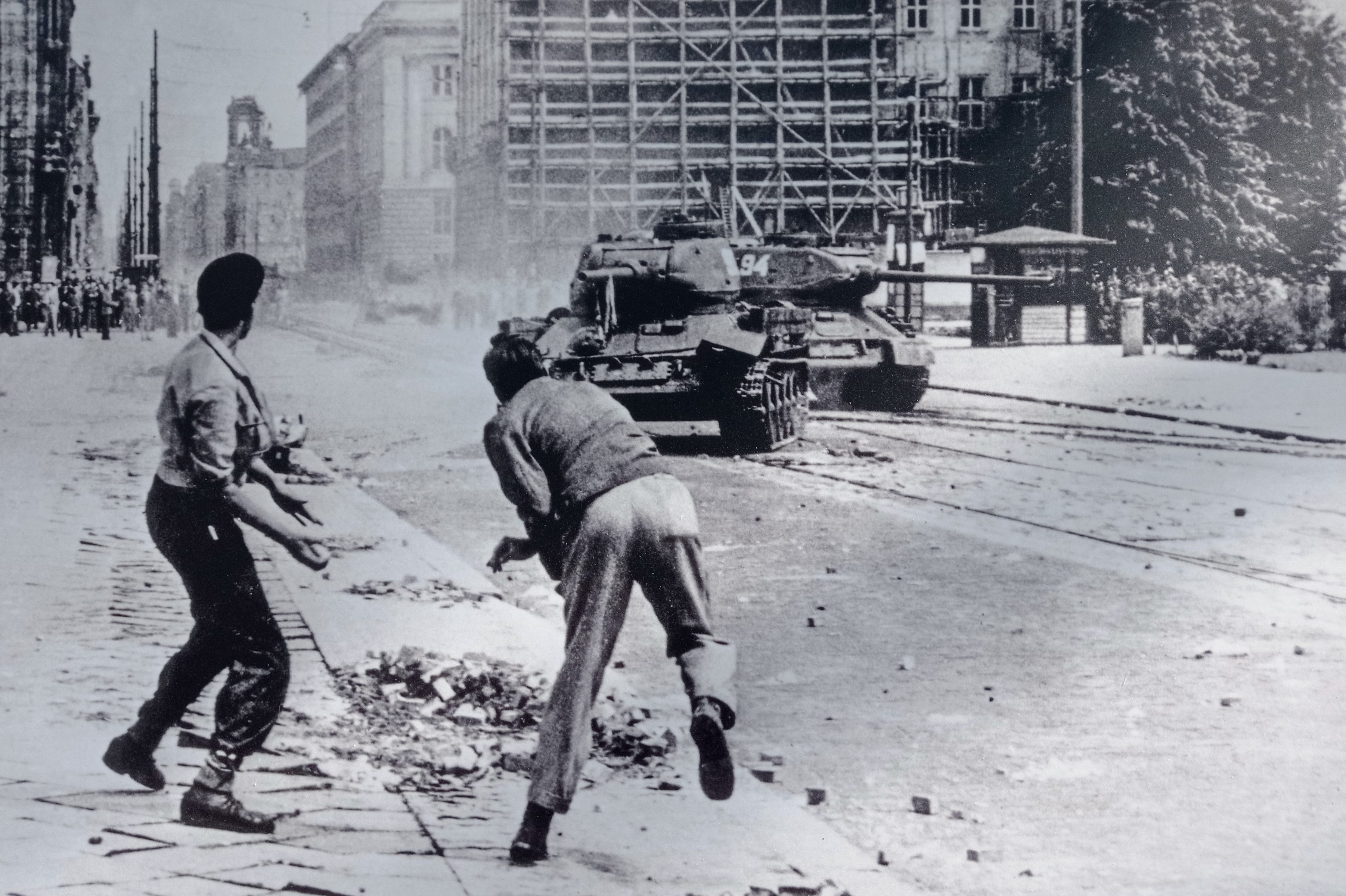Nur mit sowjetischer Hilfe und dem Einsatz des eigenen Militärs konnte der Volksaufstand vom 17. Juni 1953 in Ost-Berlin (Foto links) und anderen Städten der DDR niedergeschlagen werden. In Halle bekam das Händel-Denkmal ein Schild mit dem Spottvers „Spitzbart, Bauch und Brille ist nicht unser Wille“ umgehängt, womit Walter Ulbricht, Staatspräsident Wilhelm Pieck und Ministerpräsident Otto Grotewohl gemeint waren.