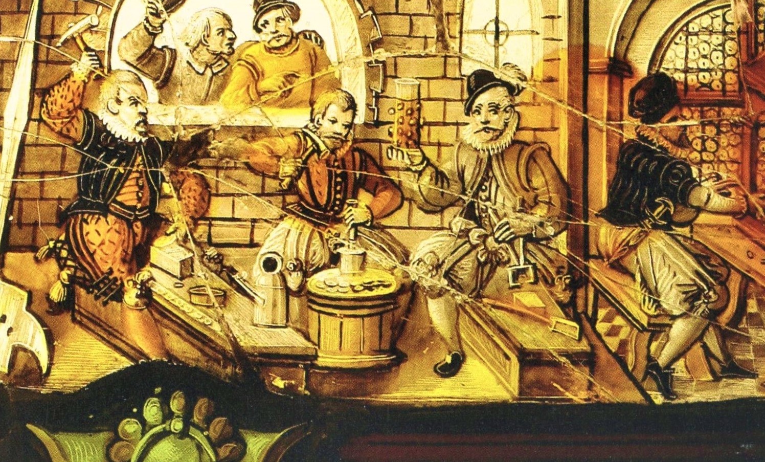 In der Schweiz hat man Szenen aus Münzstätten gern auch auf Glasbilder gemalt. Die einer im Luzerner Museum gezeigte Darstellung laden in eine Geldschmiede ein.