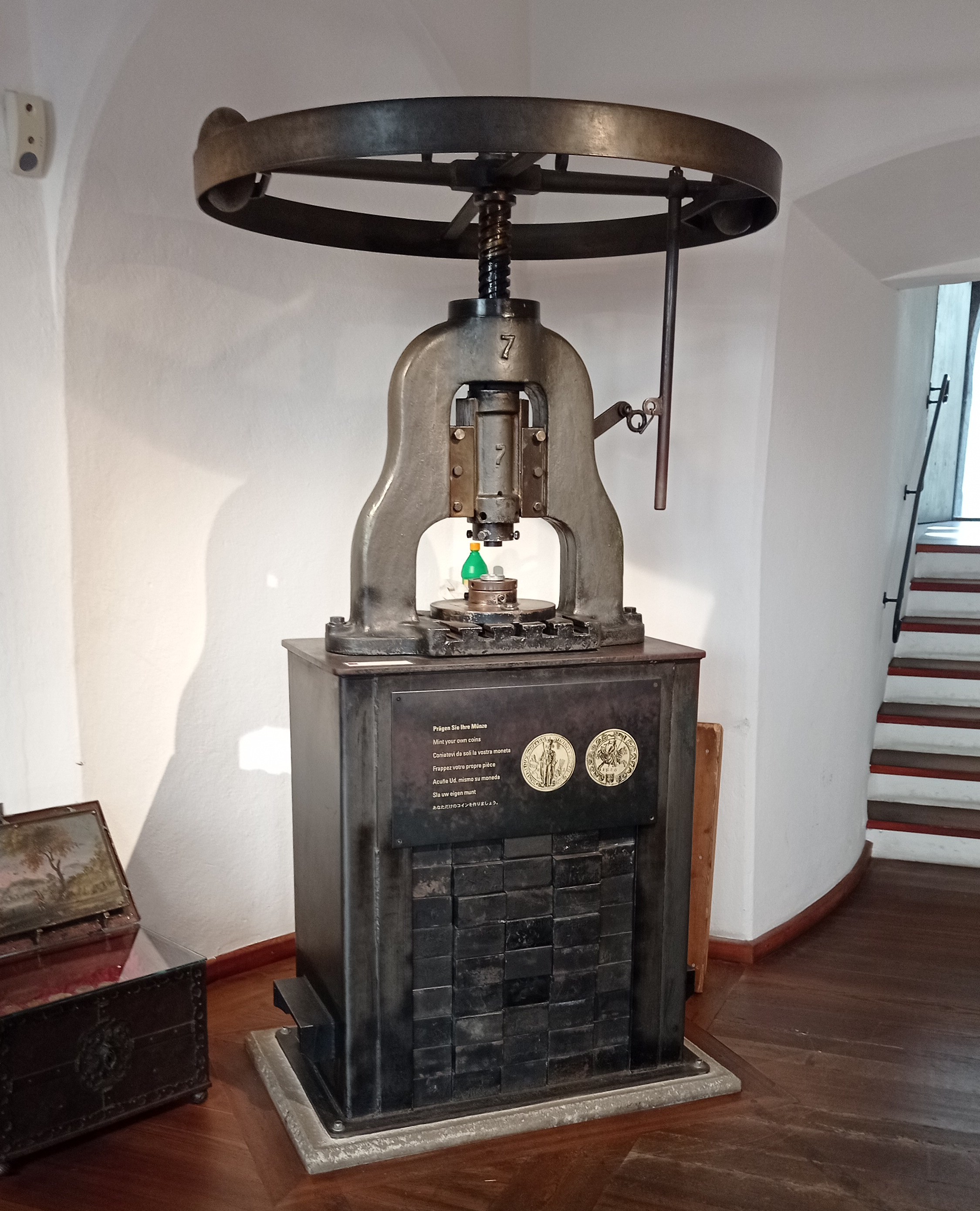 Im Kassenraum des Münzmuseums kann man auf einer Spindelpresse aus dem 19. Jahrhundert Souvenirmedaillen prägen.