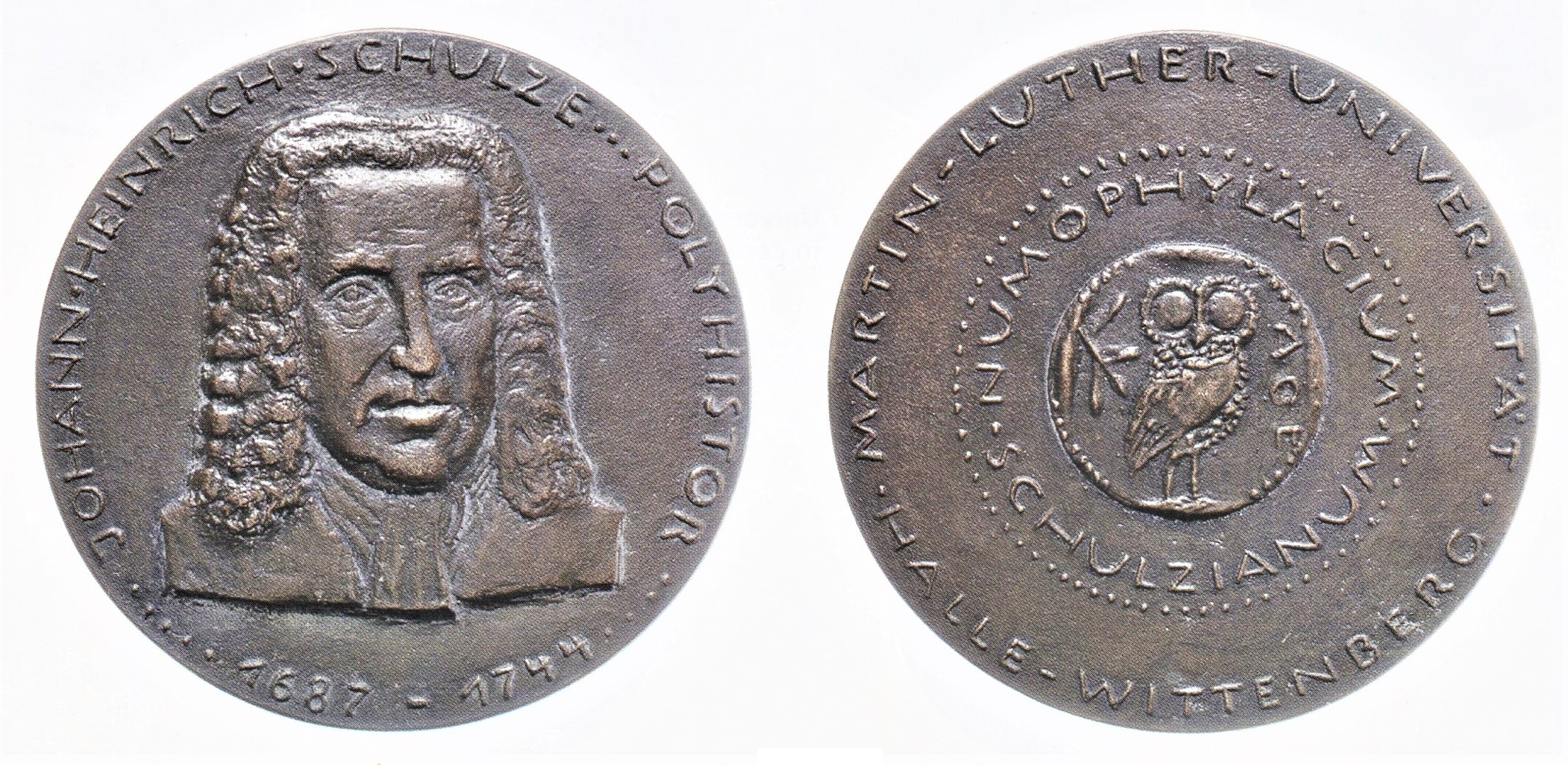 Der deutsche Universalgelehrte Johann Heinrich Schulze begründete in Halle an der Saale die Numismatik als akademisches Lehrfach. Heidi Wagner-Kerkhof gestaltete 1979 eine Bronzemedaille mit einer auf seine numismatischen Vorlesungen deutenden Tetradrachme aus Athen.