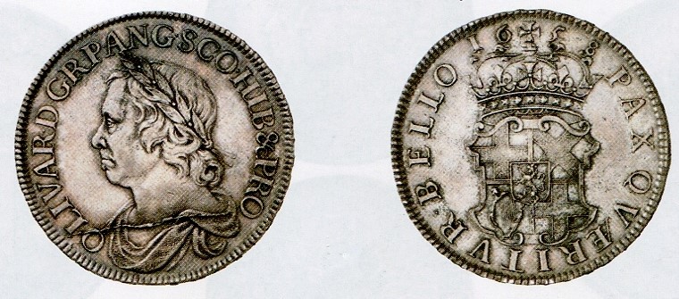 Die braunschweigische Pfaffenfeindtaler von 1622 und die Krone mit dem Bildnis des englischen Lordprotektors Oliver Cromwell von 1655, bei dem der Stempelriss am Hals als Hinweis auf sein baldiges Ende gedeutet wurde.