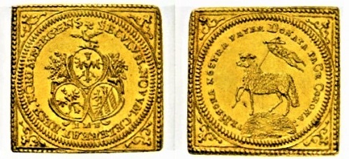 Unter den Nürnberger Neujahrsdukaten findet man die so genannten Lämmlein- oder Lammdukaten im Wert von zwei, einem, einem halben sowie einem Achtel, Sechzehntel und Zweiunddreißigstel Dukaten. Die um das Jahr 1700 geprägten Neujahrsmünzen kamen im Zusammenhang mit dem seinerzeit als eine Art Zeitenwende diskutierten Übergang vom 17. auf das 18. Jahrhundert heraus. Auf den Lämmleindukaten erkennt man das Stadtwappen und das auf der Erdhalbkugel stehende Lamm Gottes mit einer wehenden Fahne. „Die Stadt Nürnberg feiert den Beginn des neuen Jahrhunderts“ liest man als Übersetzung aus dem Lateinischen auf den größeren Stücken. Manche Neujahrsgeschenke in der runden, manchmal auch in der viereckigen Version waren so klein, dass sie sich in Geldbörsen schnell verkrümelten. Da man eine Lupe oder Linse brauchte, um sie zu betrachten, hat man sie auch Linsendukaten genannt. Für die Stempelschneider war es eine große Herausforderung, Wappen und Lamm auf den Winzlingen unterzubringen. Immerhin misst der Winzling zu 1/32 Dukaten gerade einmal fünf Millimeter und wiegt 0,12 Gramm.