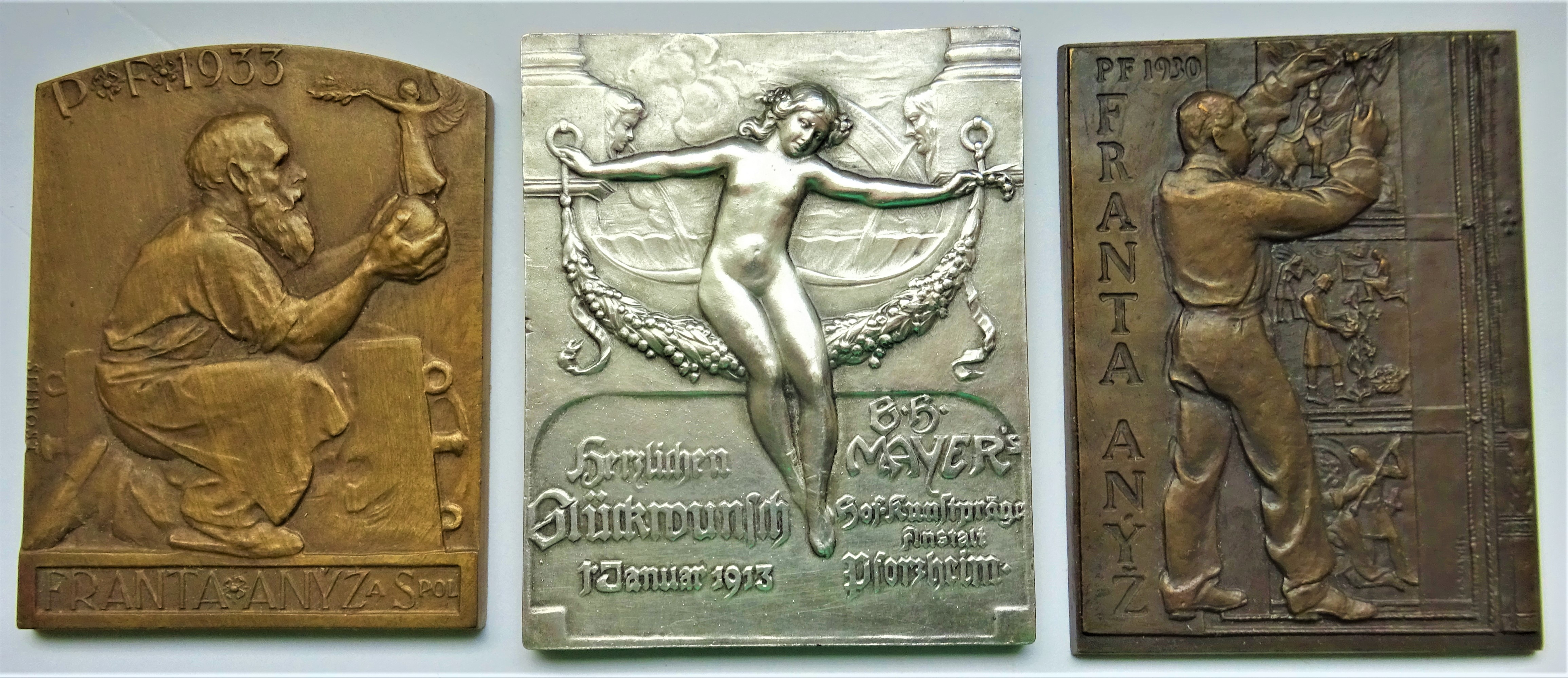 Der tschechische Bildhauer Franta Anyz erfreute seine Freunde und Kunden mit solchen Neujahrsplaketten. Die Abkürzung PF kommt aus dem Italienischen più forte und meint, dass die Menschen und das neue Jahr stärker und besser werden mögen.