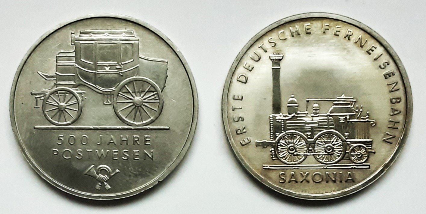 Die DDR gab 1990 und 1988 5-Mark-Stücke mit der Postkutsche und der Eisenbahn „Saxonia“ heraus.