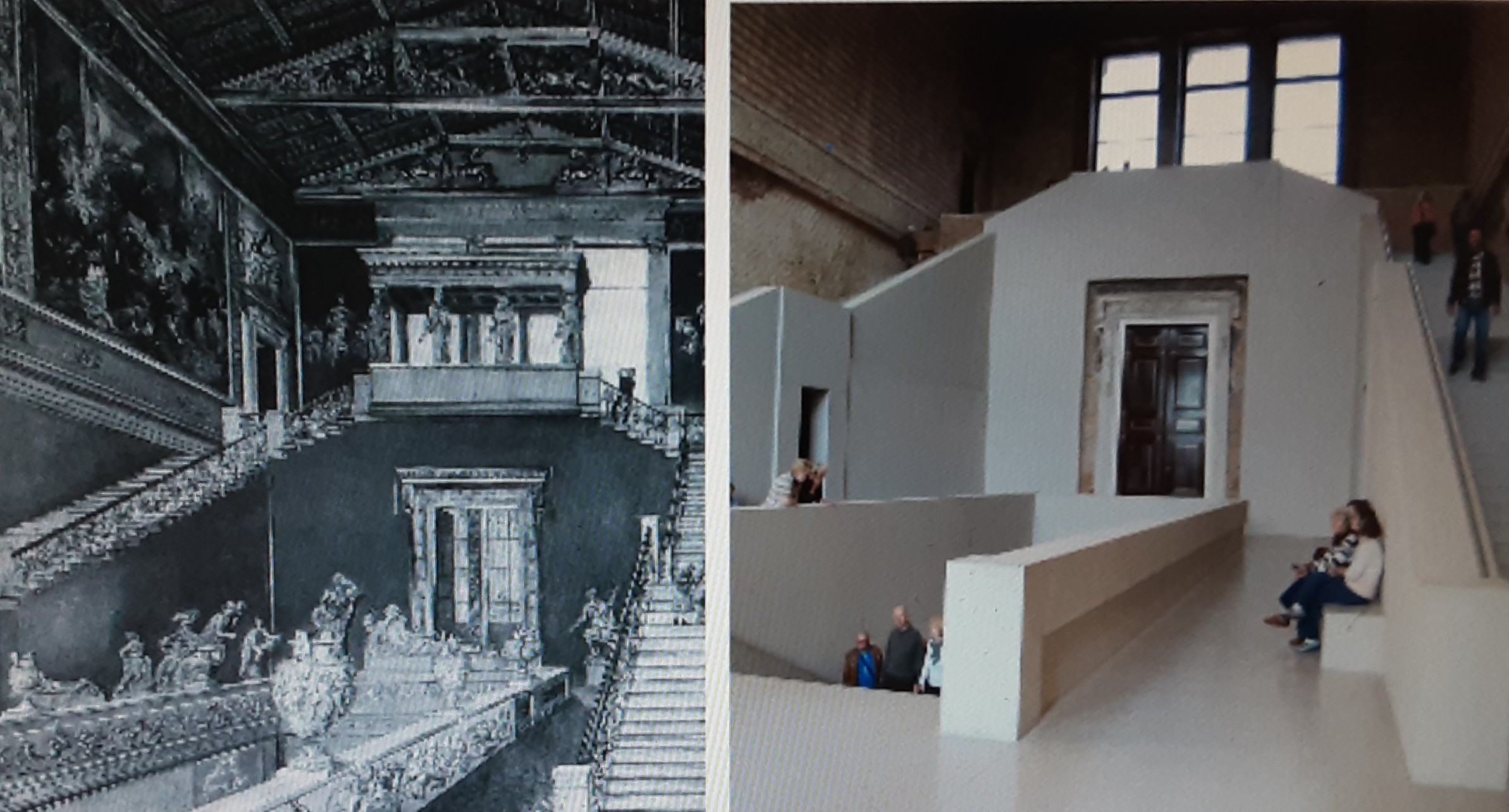 Beim Wiederaufbau des Neuen Museums konnte das bunt ausgemalte und mit Skulpturen geschmückte Treppenhaus nicht mehr wiederhergestellt werden. David Chipperfield entwarf einen neuen Zugang zu den einzelnen Etagen, der auch zum Verweilen einlädt.