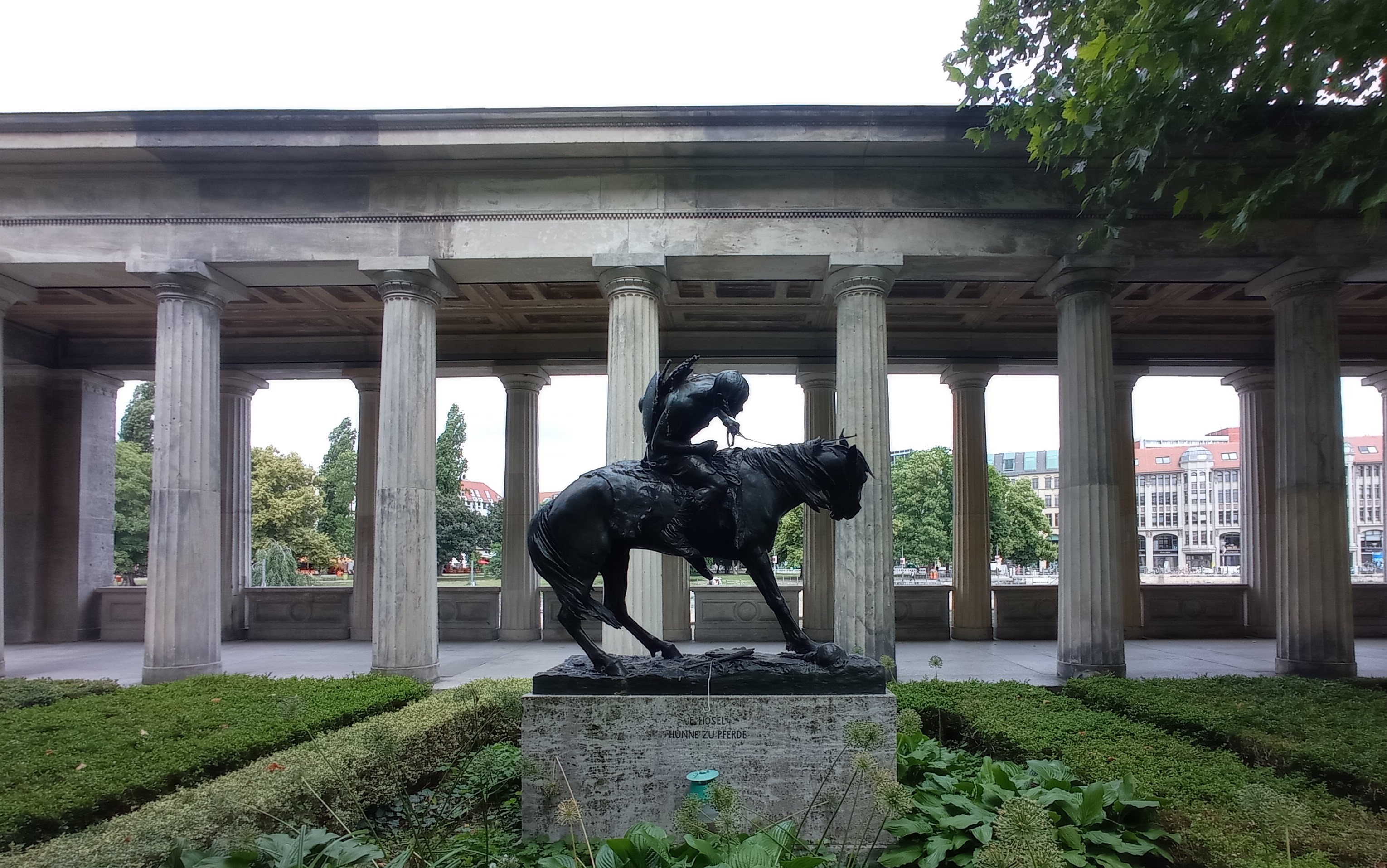 Mit der gleichen Sorgfalt, mit der die Museen gestaltet wurden, widmeten sich die Planer und Erbauer auch den Freiflächen. Frei- und Wasserflächen sind somit auf einzigartige Weise miteinander verwoben und steigern gegenseitig in ihre Wirkung, hier zu sehen an der rekonstruierten Kolonnade, di die Alte Nationalgalerie umschließt.