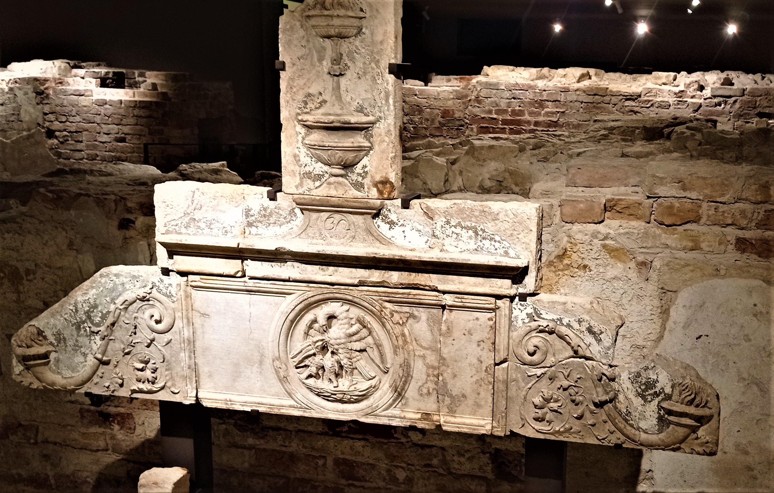 Grabungen am Schlossplatz ergaben neue Einsichten in die älteste Stadtgeschichte. Das Fassadenteil vom Vorgängerbau des Schlosses ist im Keller des Humboldt Forums ausgestellt.