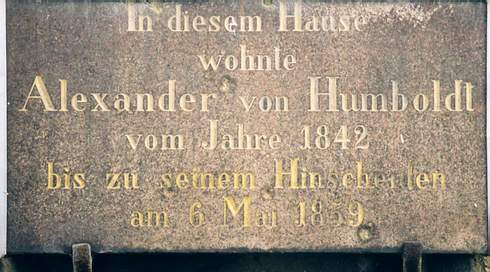 Berlin ist reich an Gedenktafeln. Schon im 19. Jahrhundert wurden Wohnhäuser von berühmten Persönlichkeiten mit solchen erinnernden Hinweisen geschmückt. Bei Um- und Neubauten hat man sie gelegentlich durch neue Tafeln ersetzt, und die alten landeten manchmal im Müll. Beim Wohnhaus des Weltreisenden Alexander von Humboldt in der Oranienburger Straße 67 gibt es den seltenen Fall, dass sich dort die alte und eine neue Tafel erhalten haben. Unlängst wurde im umgebauten und modernisierten Hof des vor allem bei Bierkennern und wegen der deftigen Kost, aber auch durch wechselnde Ausstellungen beliebten Restaurants „Aufsturz“ eine Granittafel mit vergoldeter Lettern im Beisein von Bezirksbürgermeister Joachim Zeller eingeweiht. Die Inschrift prangte ursprünglich an der Straßenfront des von Alexander von Humboldt von 1842 bis zu seinem Tod im Jahre am 6. Mai 1859 bewohnten Hauses. Gestiftet wurde die Tafel nach 1859 von der mit Humboldt befreundeten Familie Mendelssohn.