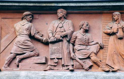 Dass Skulpturen und Inschriften an öffentlichen Gebäuden auf Bauherren und historische Ereignisse hinweisen, ist nichts Ungewöhnliches. In Berlin findet man auf Schritt und Tritt solche Hinweise, mit denen die Bauwerke gleichsam geadelt wurden. Auch der aus 36 Tafeln bestehende Bilderfries rund um das Rote Rathaus wurde 1876 bis 1879 in spätklassizistischen Formen als eine Art steinerne Chronik angebracht. Dargestellt sind Episoden von der Frühzeit der Stadt bis zur Reichsgründung im Jahre 1871. Auf den von den Bildhauern Ludwig Brodwolf, Alexander Calandrelli, Otto Geyer und Rudolf Schweinitz gestalteten Terrakottaplatten in den Maßen von sechs mal einem Meter erscheinen Bürger, Handwerker, Ritter, Fürsten, Soldaten, Gelehrte, Künstler und viele andere Personen. In der Regel sind es Männer, die hier posieren; Frauen spielen als Staffage eine Nebenrolle, und das entspricht genau dem Frauenbild der Kaiserzeit.