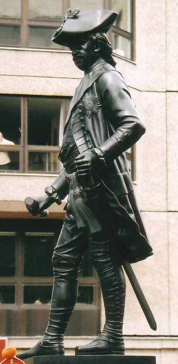 Fürst Leopold von Anhalt-Dessau, genannt der Alte Dessauer, war ein ungewöhnlicher Mann, der nicht viel von Konventionen hielt. Gegen den Willen seiner hochadligen Familie heiratete er ein bürgerliches Mädchen, die Apothekertochter Anna Luise Föhse, die 1701 von Kaiser Leopold I. in den Stand einer Reichsfürstin erhoben wurde, wobei wohl auch Bestechungsgelder geflossen sind. Berühmt wurde Leopold jedoch nicht nur durch seine unstandesgemäße Heirat, sondern vor allem als königlich-preußischer Generalfeldmarschall. In dieser Position führte in der Armee seines Freundes, des Soldatenkönigs Friedrich Wilhelm I., strengen Drill und Gleichschritt ein, übte die Soldaten im Gebrauch des eisernen Ladestocks, tat sich aber auch in der Kunst des Festungsbaus hervor. Ausdrücklich vermerkt eine Inschriftenplatte, die in den Sockel eingelassen ist: "Das Preussische Heer verdankt ihm die strenge Manneszucht und die Verbesserung seiner Krieger zu Fuß". In Anhalt-Dessau mühte sich Leopold, der von 1676 bis 1747 lebte, um die Verbesserung der Landwirtschaft und veranlasste umfangreiche Entwässerungsarbeiten sowie die Anlage von Deichen zum Schutz vor dem Hochwasser der Elbe. Unter seiner Regentschaft wurde die Haupt- und Residenzstadt Dessau mit sternförmigen Straßenkreuzungen und schnurgeraden Straßen versehen, so als ob ein Regiment zur Parade antritt.